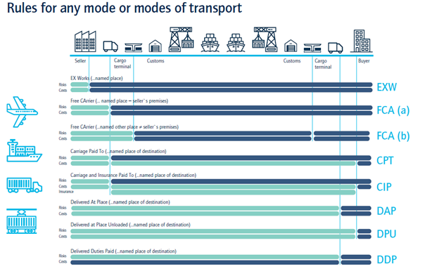 - FCA (Free Carrier): The seller is responsible for costs until the goods are delivered to the carrier at an agreed location. From this point, the buyer assumes responsibility.