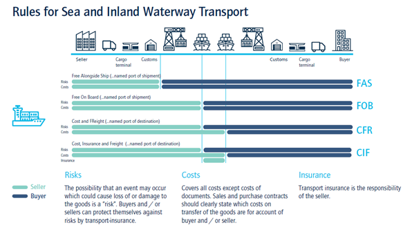 - FOB (Free On Board): The seller covers the costs and risks until goods are loaded onto the ship. The risk transfers to the buyer once the goods are on board.