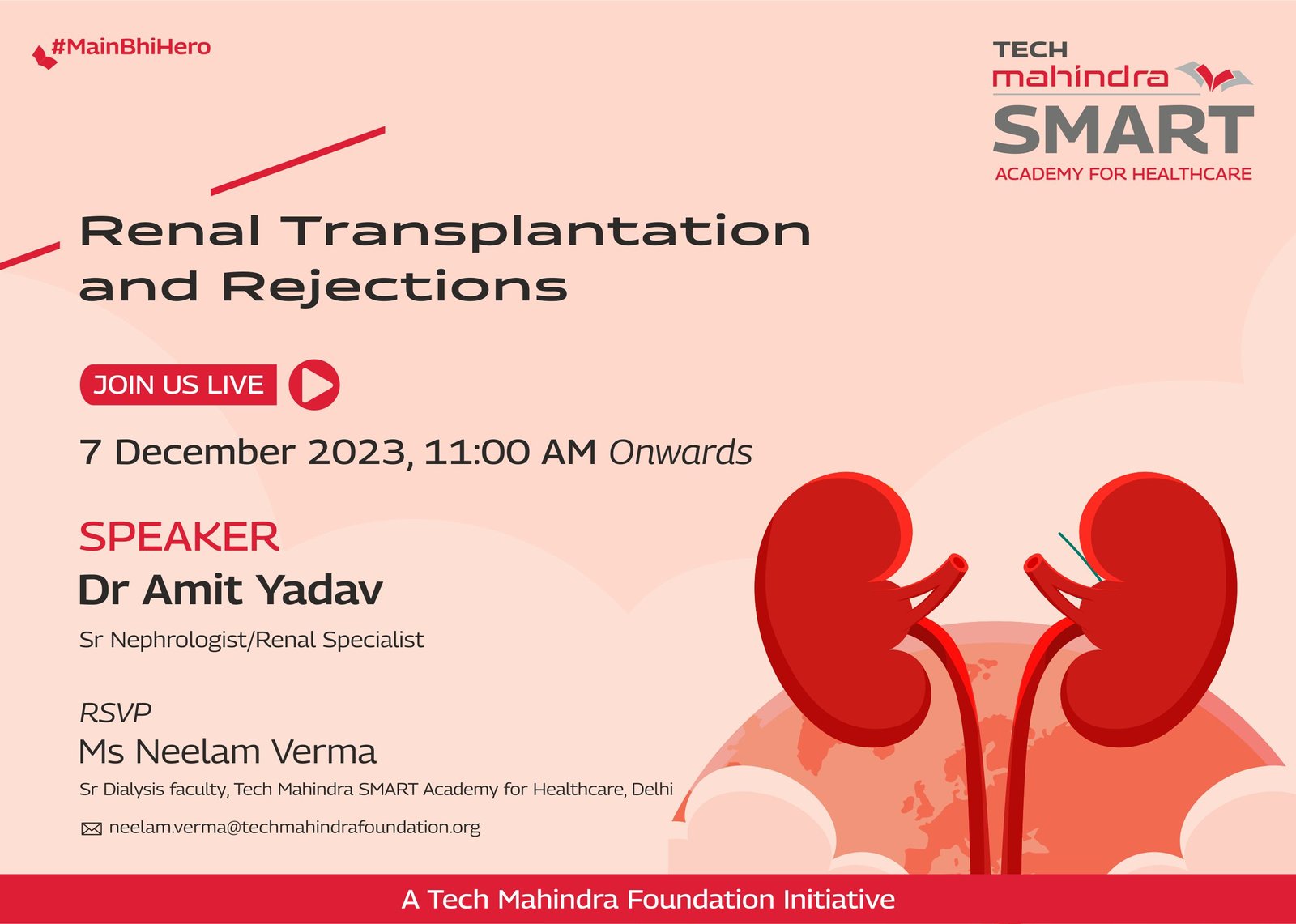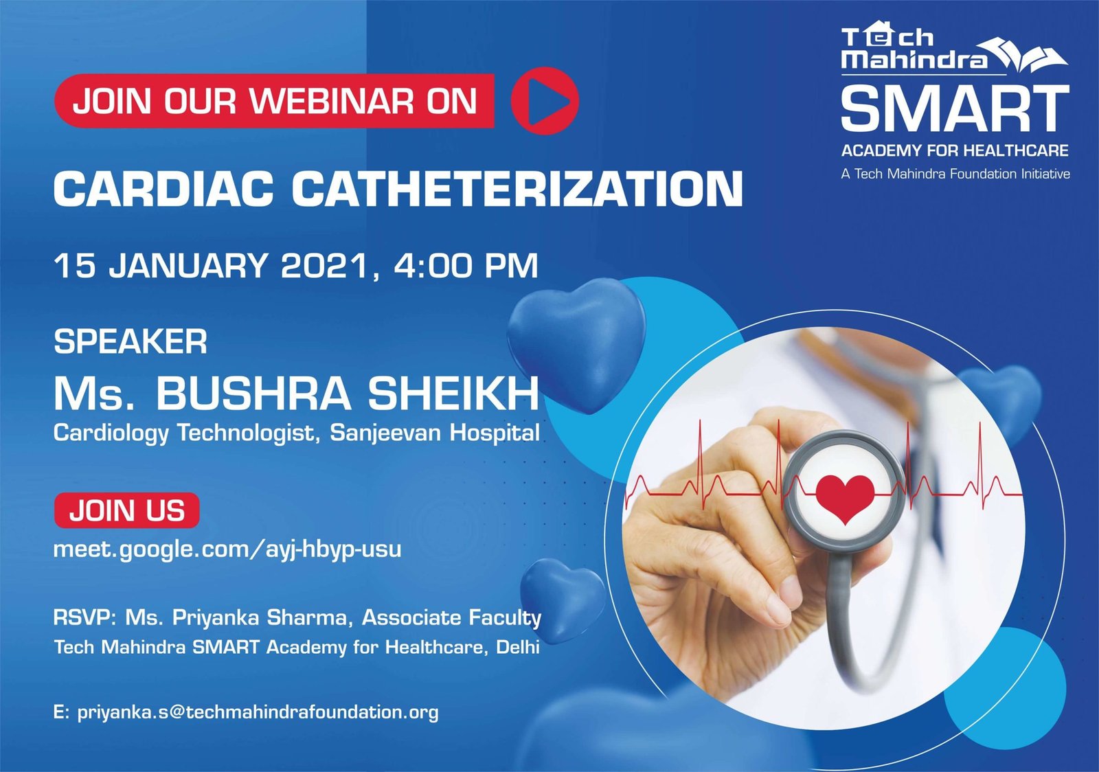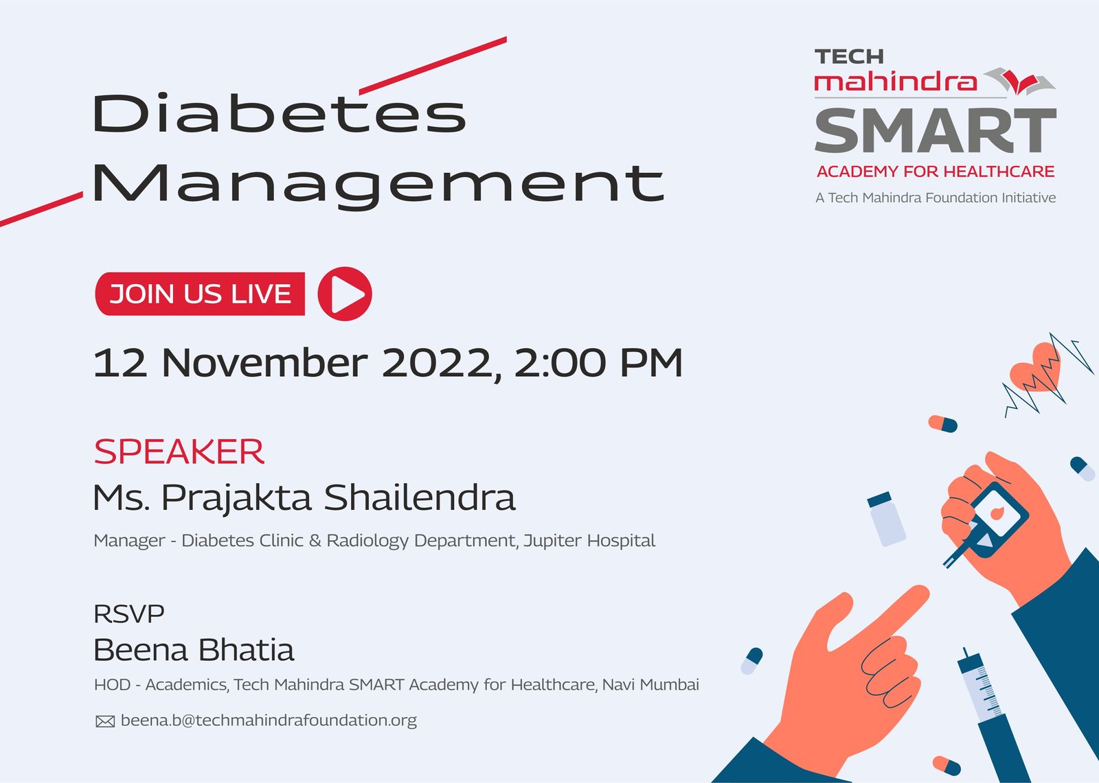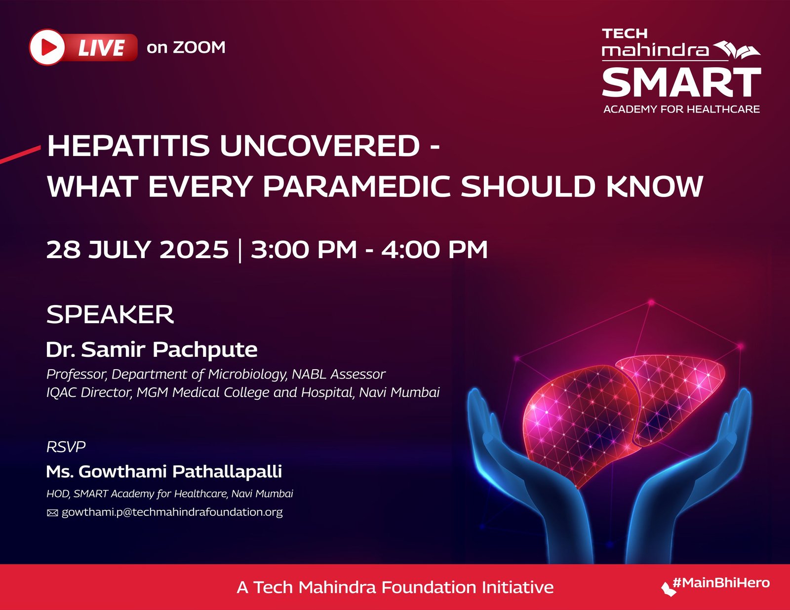 Tech Mahindra SMART Academy for Healthcare, Mumbai, is pleased to host a special webinar titled “Saving Lives Together: The Value of Safe Blood & Donors” for our healthcare students, alumni, trainers, and partners across all academies. The speaker, Dr. Rinku Bhatia, an experienced Blood Bank Officer will highlight the critical role of safe and well-functioning blood banks in saving lives. Dr. Bhatia will delve into the lifesaving impact of timely blood donations, the importance of donor safety, and how an efficient blood system benefits both patients and donors.